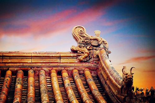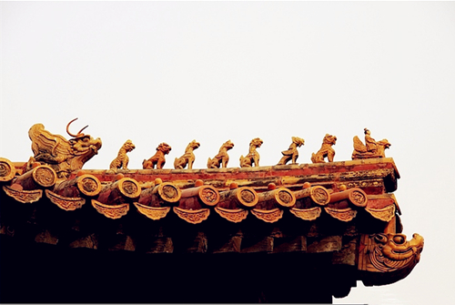 • 戧脊上是1行跑獸,從前到后,最前面的領隊是一個騎風仙人,然后依次為:龍、鳳、獅子、天馬、海馬、狻猊、押魚、獬豸、斗牛、行什,共計10只。